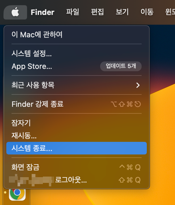 1. 좌측 상단 Apple 메뉴에서 시스템 종료를 선택한다.