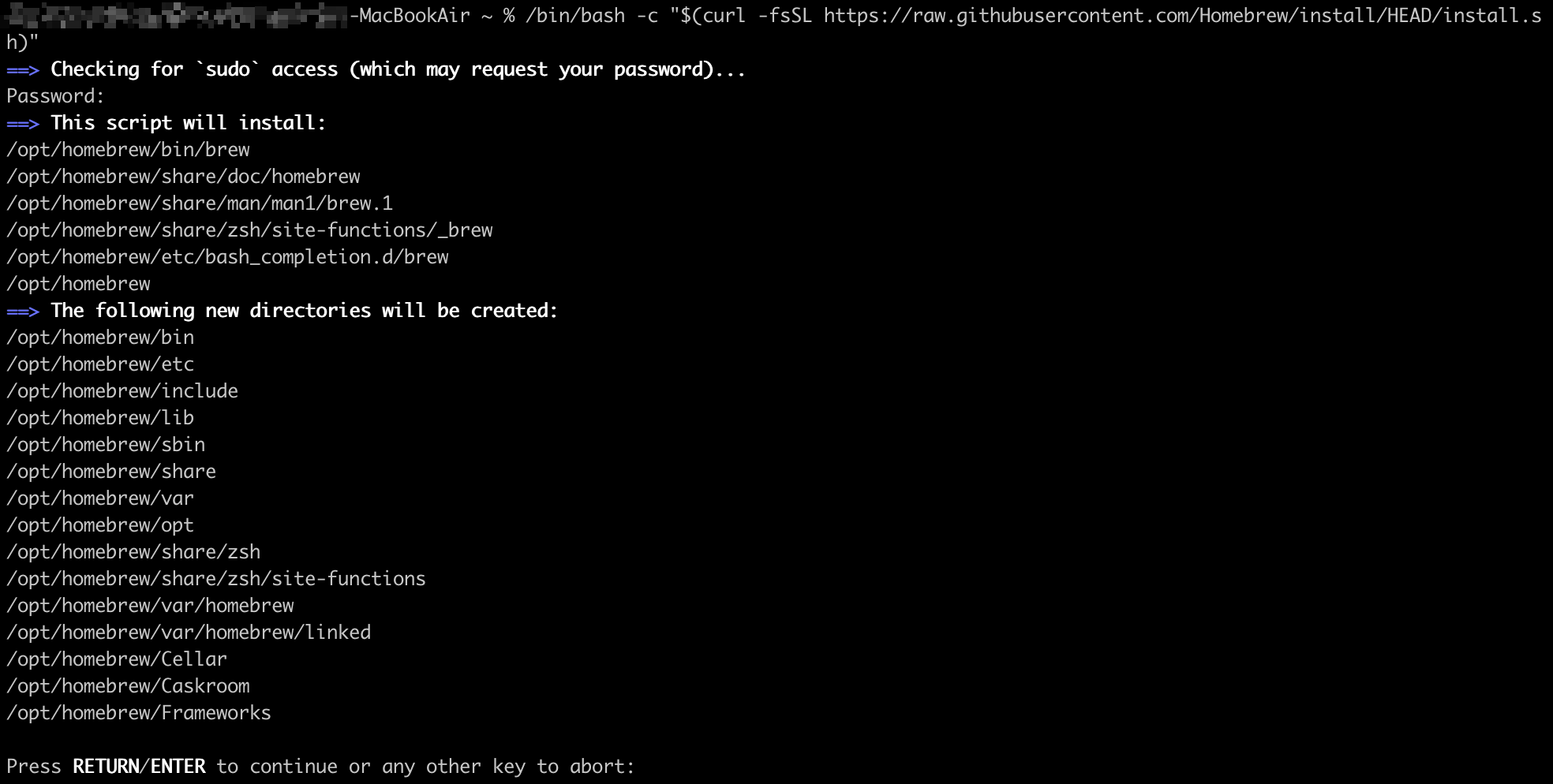 명령을 실행하면 설치가 진행되고 계속 설치를 위해 중간에 엔터키를 한번 눌러준다.
