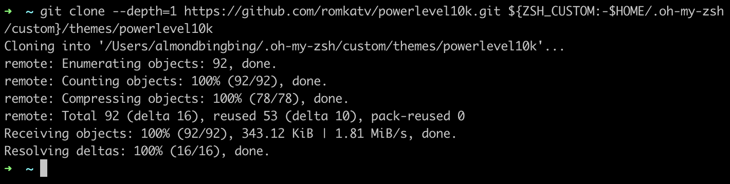 ~ git clone --depth=1 https://github.com/romkatv/powerlevel10k.git ${ZSH_CUSTOM:-$HOME/.oh-my-zsh/custom}/themes/powerlevel10k